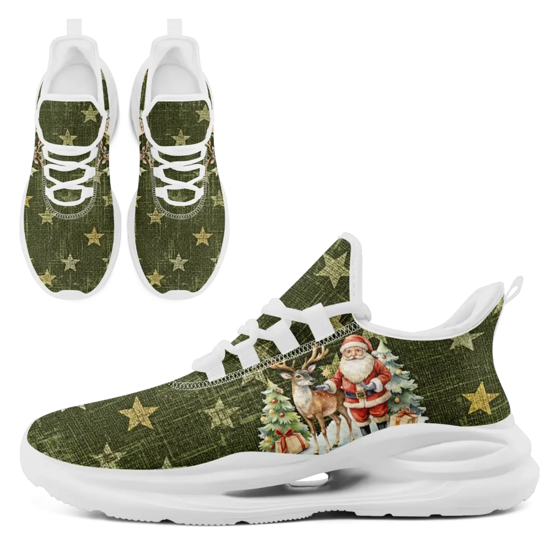 These trainers feature a beautifully rendered scene of Santa Claus with his loyal reindeer beside a decorated tree, set against a rustic, textured green background scattered with golden stars.
